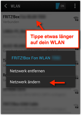 • Tippe etwas länger auf das WLAN-Netz, mit dem du verbunden bist.