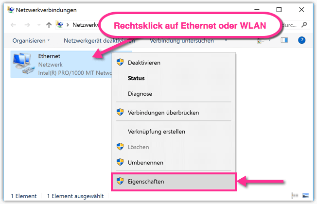 • Klick mit der rechten Maustaste auf dein Wlan oder Ethernet Anschluss.